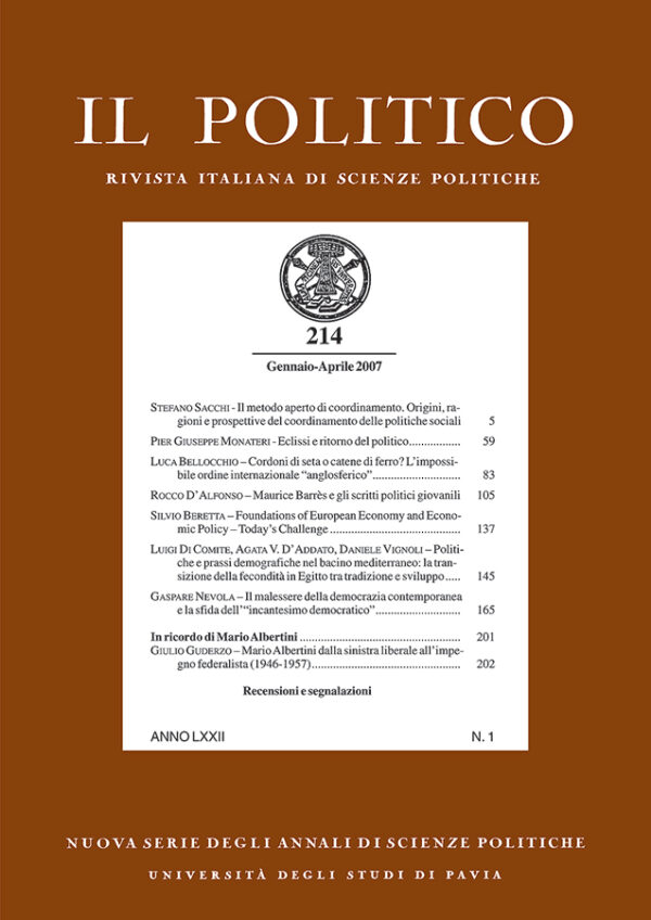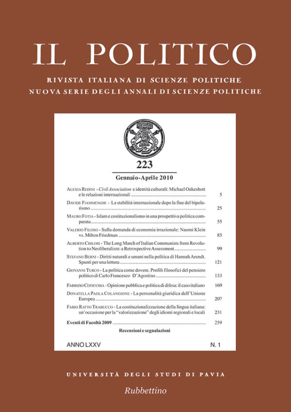 La rivista “Il Politico” si pubblica dal 1950 (fondatore Bruno Leoni) quale continuazione degli “Annali di Scienze Politiche” fondati nel