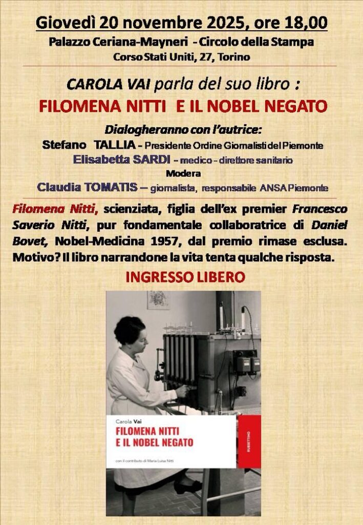 20 Novembre 2025, ore 18:00 - Torino Palazzo Ceriana-Mayneri, Circolo della Stampa Carola Vai Filomena Nitti e il Nobel negato FacebookPinterestTwitterLinkedIn