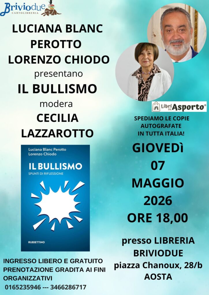 07 Maggio 2026, ore 18:00 - Aosta Libreria Briviodue, piazza Chanoux 28/b Luciana Blanc Perotto, Lorenzo Chiodo Il bullismoSpunti di riflessione FacebookPinterestTwitterLinkedIn