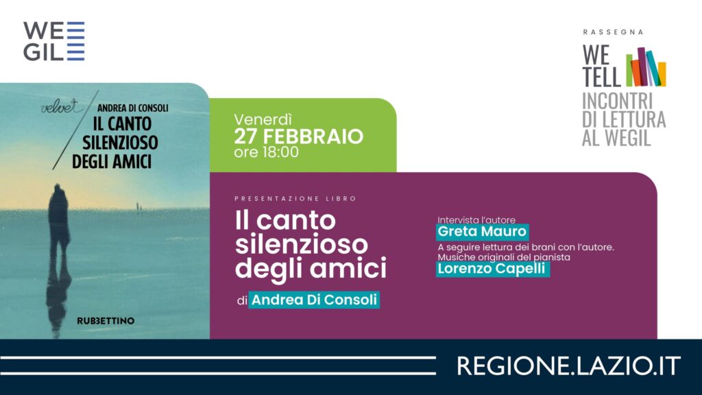 27 Febbraio 2026, ore 18:00 - Roma Spazio Regione Lazio WeGil Andrea Di Consoli Il canto silenzioso degli amiciCon una nota introduttiva di Franco Arminio FacebookPinterestTwitterLinkedIn