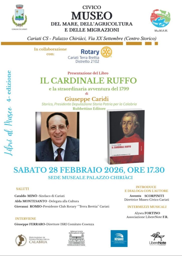 28 Febbraio 2026, ore 17:30 - Cariati Palazzo Chiriaci Giuseppe Caridi Il cardinale Ruffoe la straordinaria avventura del 1799 FacebookPinterestTwitterLinkedIn