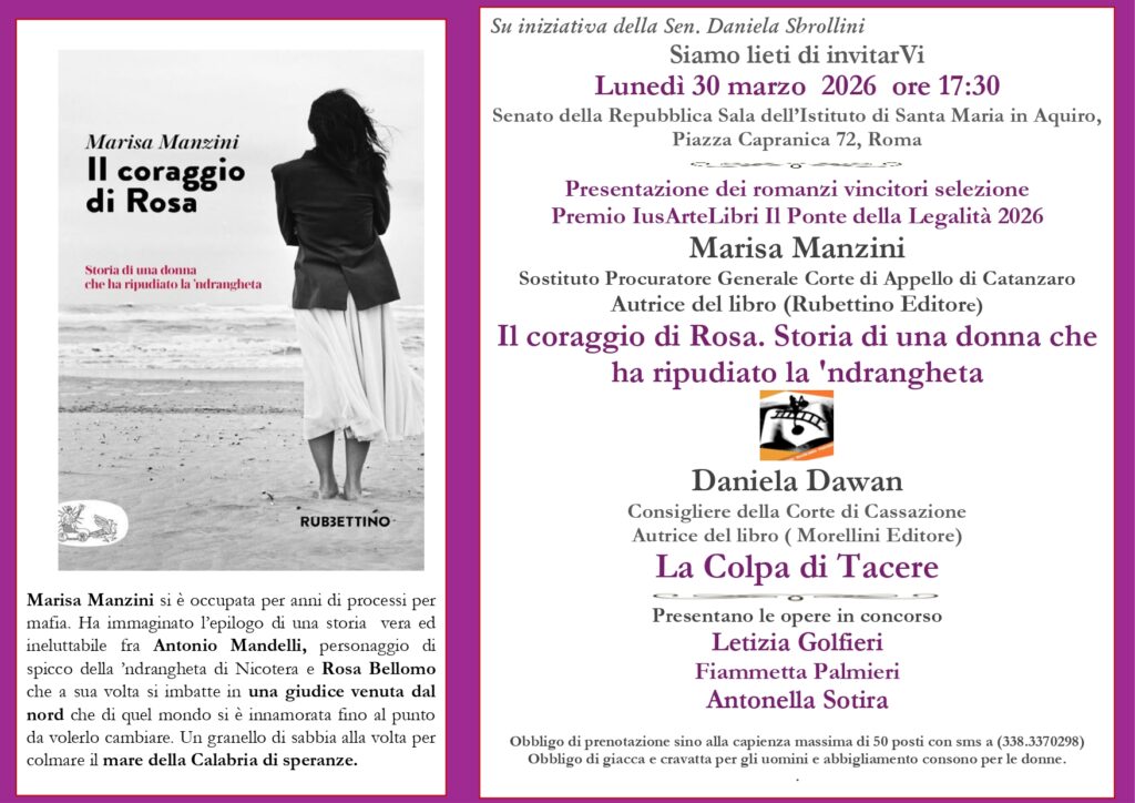 30 Marzo 2026, ore 17:30 - Roma Senato della Repubblica, Sala dell'Istituto di Santa Maria in Aquiro, Piazza Capranica 72 Marisa Manzini Il coraggio di RosaStoria di una donna che ha ripudiato la ’ndrangheta FacebookPinterestTwitterLinkedIn