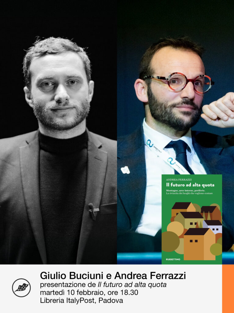 10 Febbraio 2026, ore 18:30 - Padova Libreria ItalyPost Andrea Ferrazzi (giornalista) Il futuro ad alta quotaMontagne, aree interne, periferie. La rivincita dei luoghi che vogliono contare FacebookPinterestTwitterLinkedIn