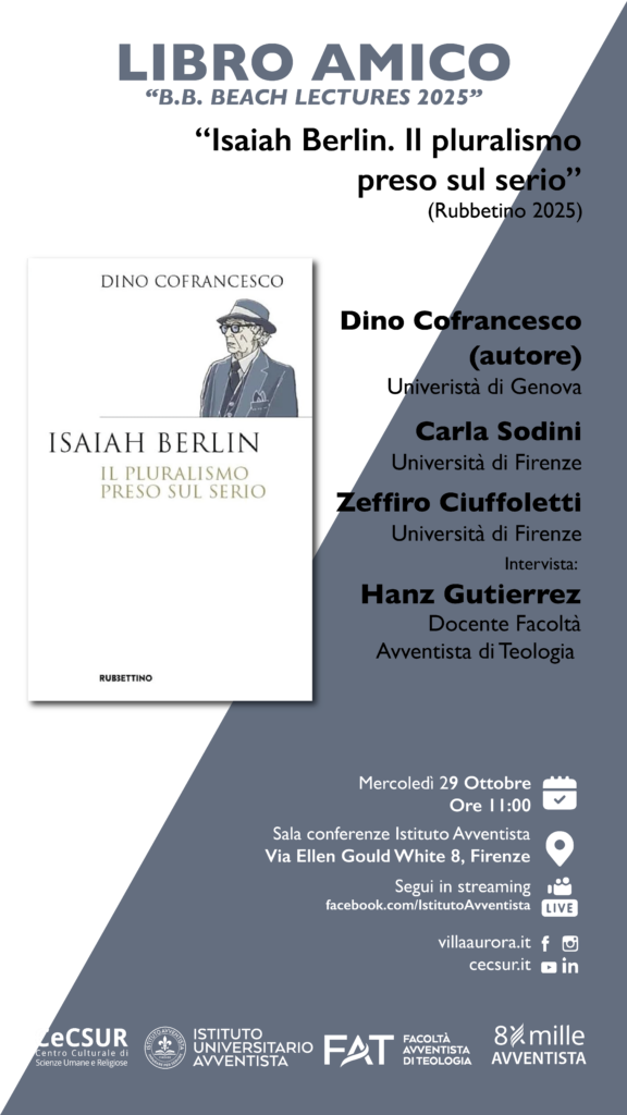 29 Ottobre 2025, ore 11:00 - Firenze Sala Conferenze Istituto Avventista, Via Ellen Gould White 8 Dino Cofrancesco Isaiah BerlinIl pluralismo preso sul serio FacebookPinterestTwitterLinkedIn