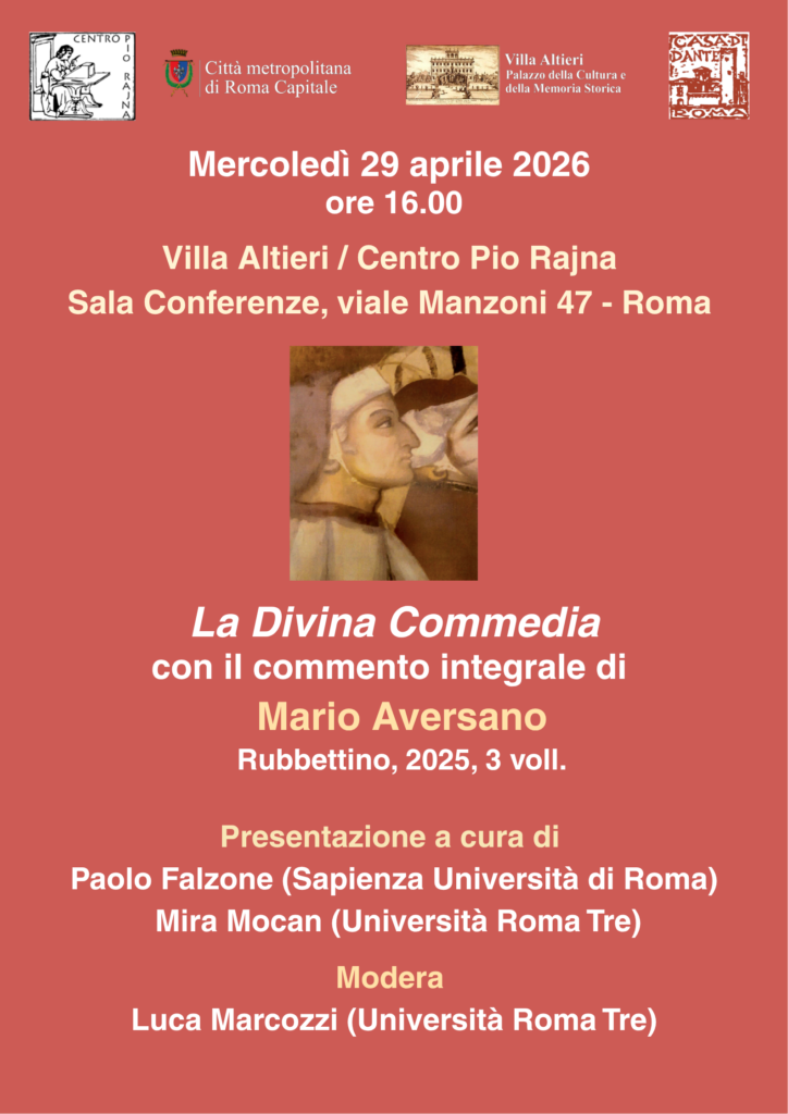 29 Aprile 2026, ore 16:00 - Roma Villa Altieri | Centro Pio Rajna Dante Alighieri La Divina Commedia – InfernoInfernoa cura di Mario Aversano Dante Alighieri La Divina Commedia – ParadisoParadisoa cura di Mario Aversano Dante Alighieri La Divina Commedia – Purgatorioa cura di Mario Aversano FacebookPinterestTwitterLinkedIn