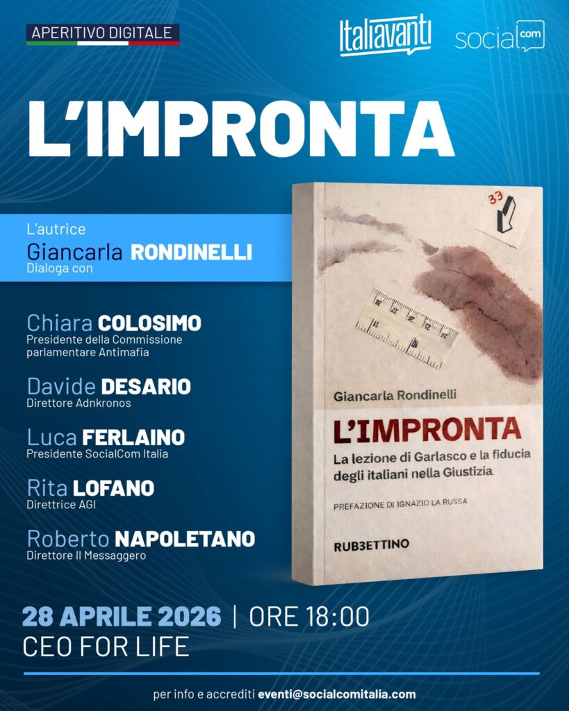 28 Aprile 2026, ore 18:00 - Online Giancarla Rondinelli L’improntaLa lezione di Garlasco e la fiducia degli italiani nella Giustizia FacebookPinterestTwitterLinkedIn