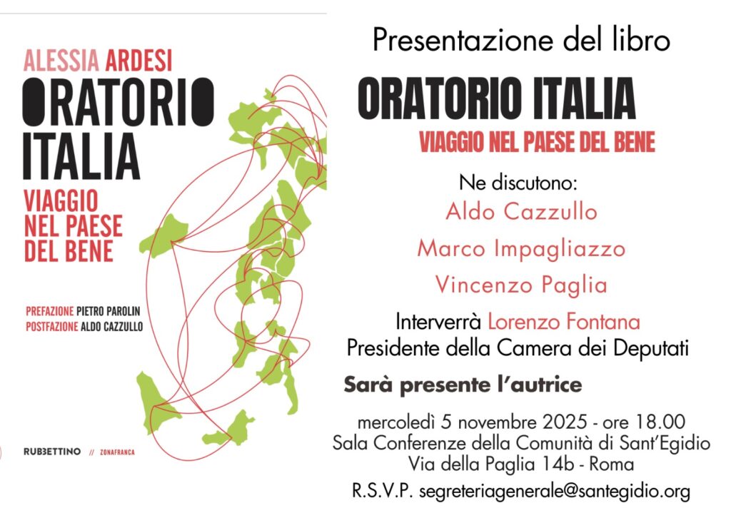 05 Novembre 2025, ore 18:00 - Roma Sala Conferenze Comunità di Sant'Egidio - Via della Paglia 14b Alessia Ardesi Oratorio ItaliaViaggio nel paese del bene Ne discutono:Aldo CazzulloMarco Impagliazzo Vincenzo Pagliamodera Giacomo Galeazzi FacebookPinterestTwitterLinkedIn
