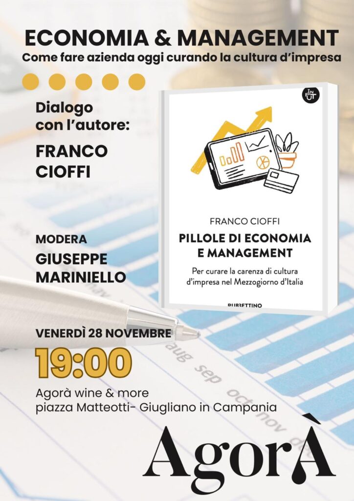 28 Novembre 2025, ore 19:00 - Giugliano di Campania Agorà wine & more Franco Cioffi Pillole di economia e managementPer curare la carenza di cultura d'impresa nel Mezzogiorno d'Italia FacebookPinterestTwitterLinkedIn