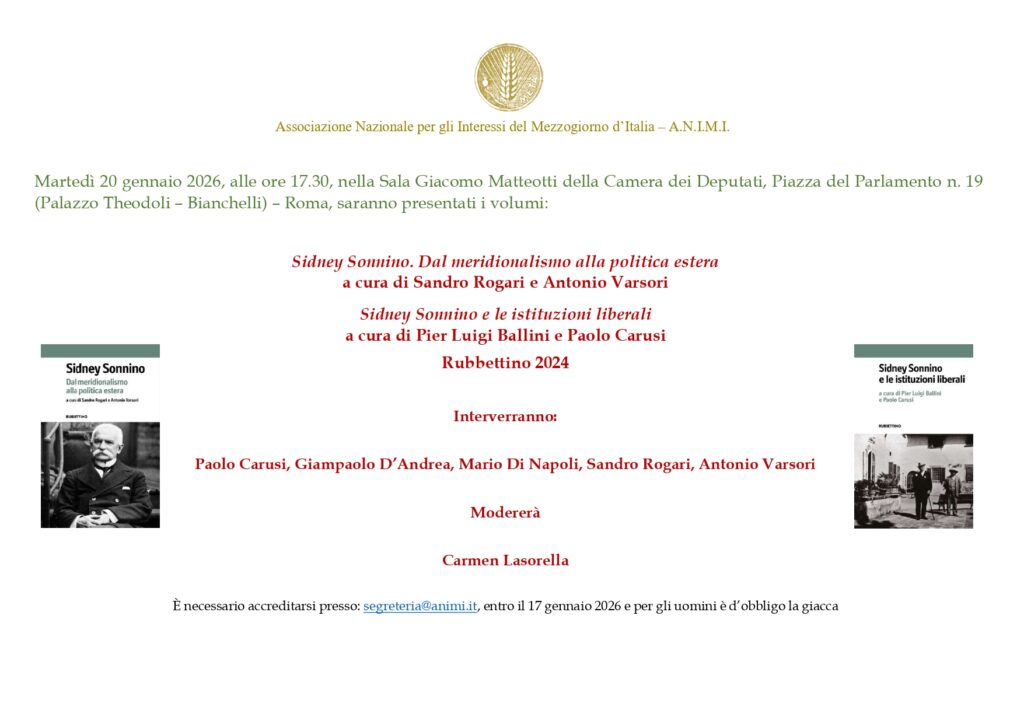 20 Gennaio 2026, ore 17:30 - Roma Camera dei Deputati, Sala Giacomo Matteotti, Piazza del Parlamento 19, Palazzo Theodoli Bacchelli AA.VV. Sidney Sonnino e le istituzioni liberalia cura di Pier Luigi Ballini e Paolo Carusi AA.VV. Sidney SonninoDal meridionalismo alla politica esteraa cura di Sandro Rogari e Antonio Varsori FacebookPinterestTwitterLinkedIn