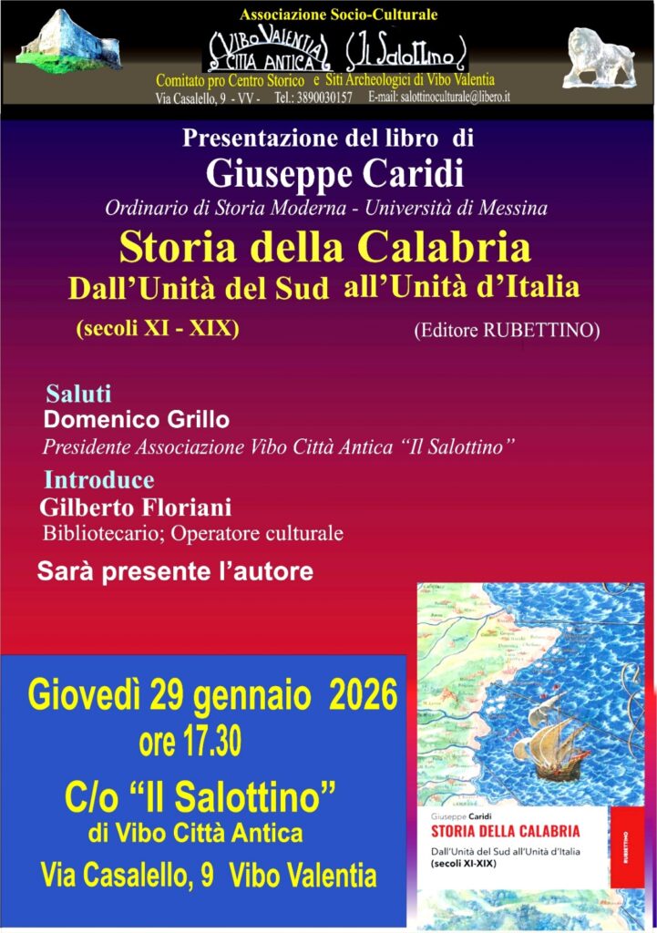 29 Gennaio 2026, ore 17:30 - Vibo Valentia Il Salottino di Vibo Città Antica Giuseppe Caridi Storia della CalabriaDall'Unità del Sud all'Unità d'Italia FacebookPinterestTwitterLinkedIn