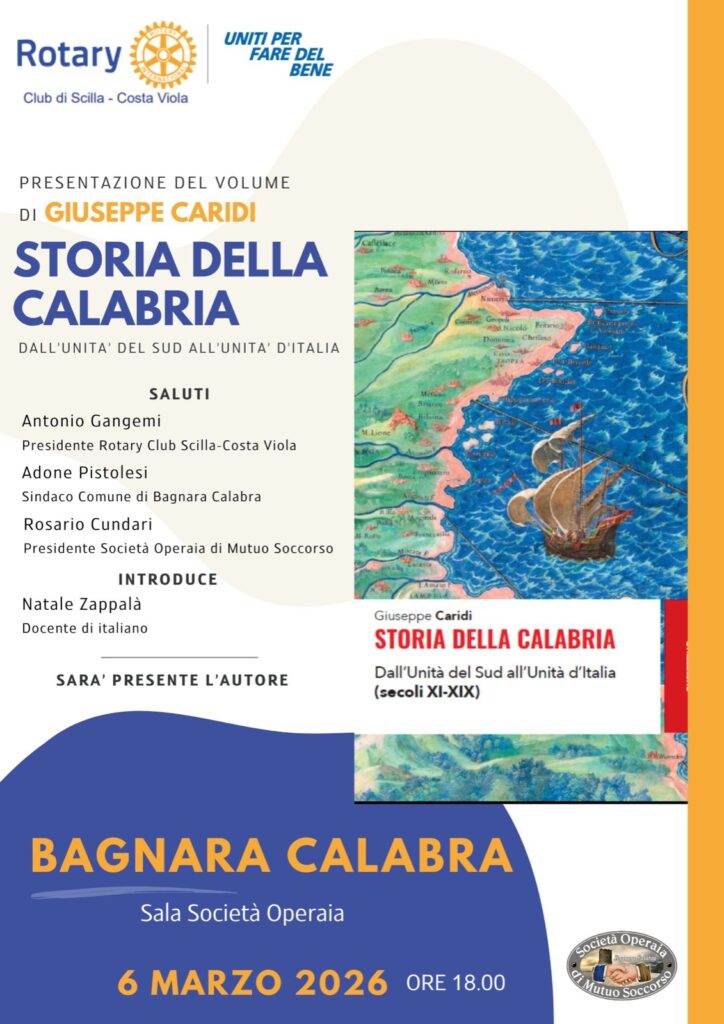 06 Marzo 2026, ore 18:00 - Bagnara Calabra Sala Società Operaia Giuseppe Caridi Storia della CalabriaDall'Unità del Sud all'Unità d'Italia FacebookPinterestTwitterLinkedIn