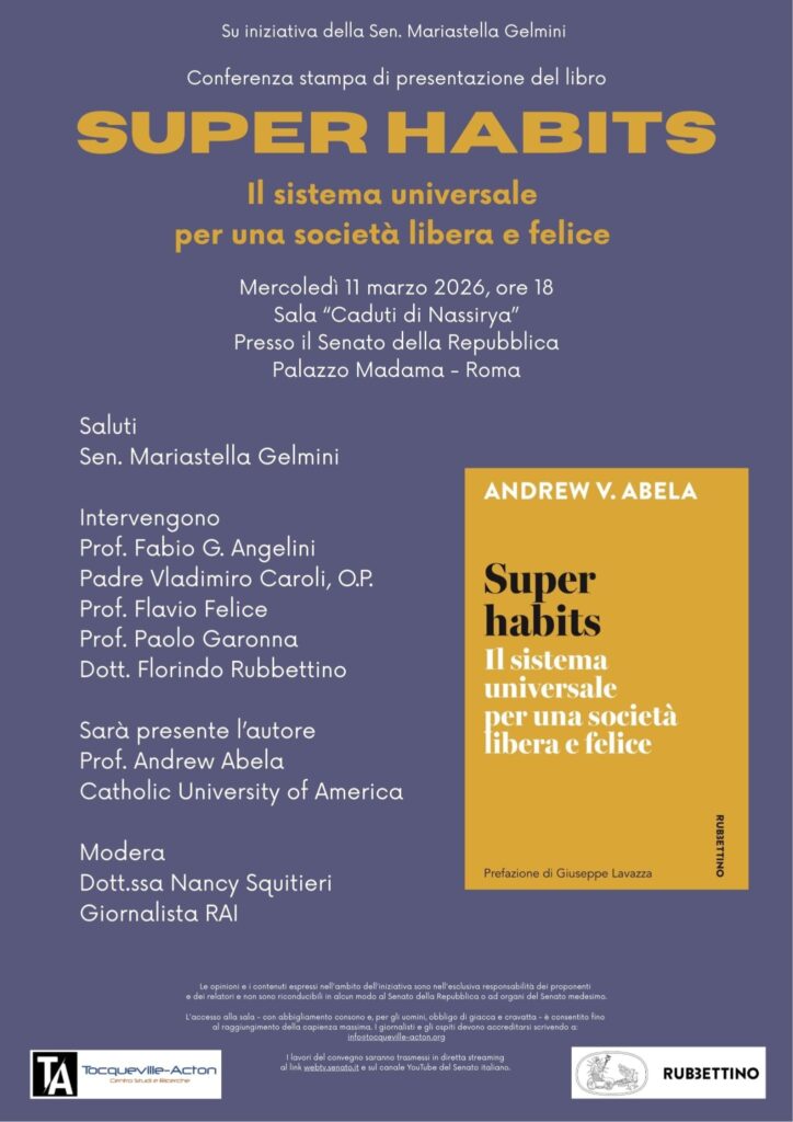 11 Marzo 2026, ore 18:00 - Roma Senato della Repubblica, Sala Caduti di Nassirya Andrew V. Abela Super habitsIl sistema universale per una società libera e felice FacebookPinterestTwitterLinkedIn