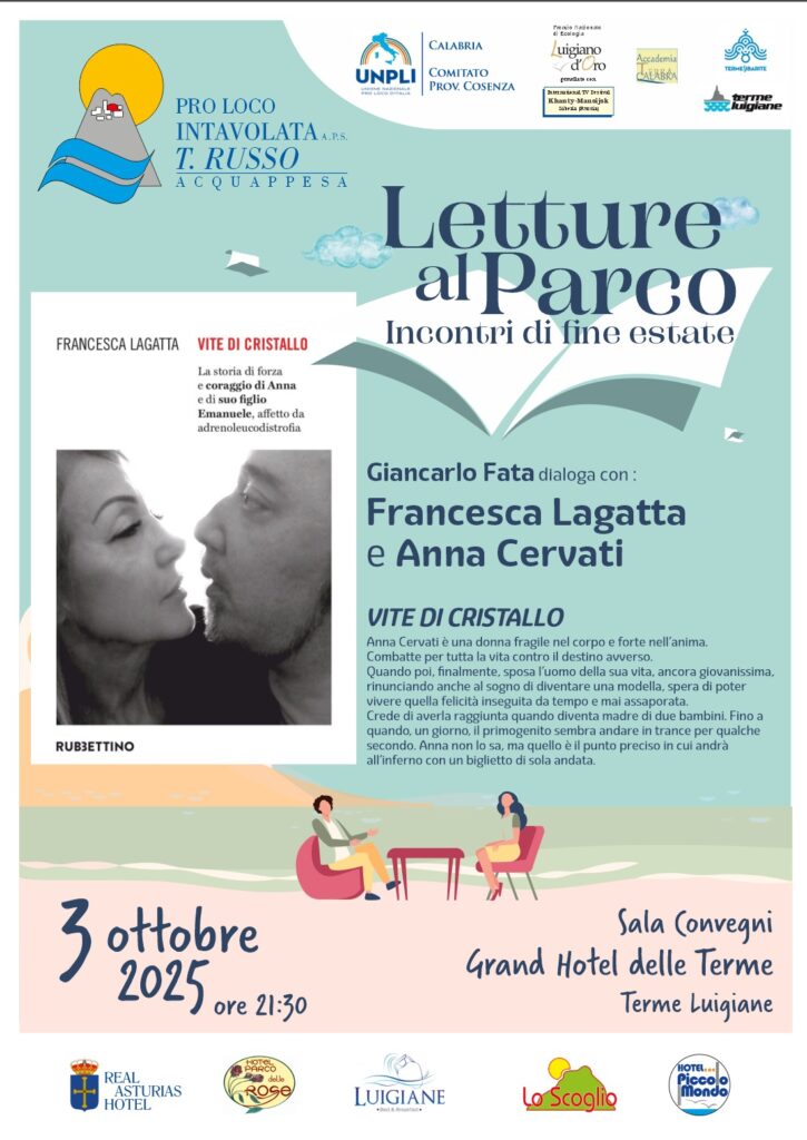 03 Ottobre 2025, ore 21:00 - Terme Luigiane, Acquappesa Sala Convegni Grand Hotel delle Terme Francesca Lagatta Vite di cristalloLa storia di forza e coraggio di Anna e di suo figlio Emanuele, affetto da adrenoleucodistrofia FacebookPinterestTwitterLinkedIn