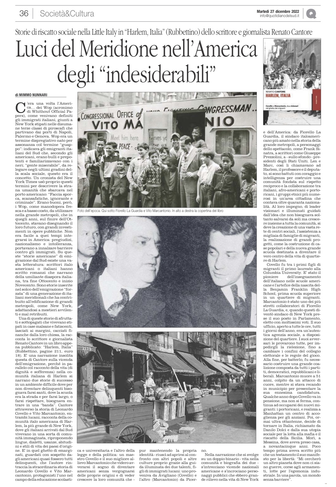 FacebookPinterestTwitterLinkedIn Luci del Meridione nell’America degli “indesiderabili” (Il Quotidiano del Sud/L'altra voce dell'Italia) di Domenico Nunnari, del 27 Dicembre 2022 Renato Cantore Harlem, ItaliaCovello e Marcantonio, due visionari nel ghetto dei migranti Scarica il pdf