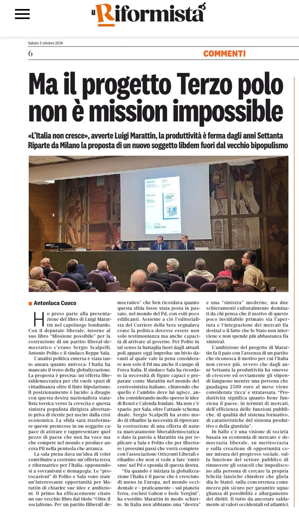 FacebookPinterestTwitterLinkedIn Ma il progetto Terzo polo non è mission impossible (il Riformista) di Antonluca Cuoco, del 5 Ottobre 2024 Luigi Marattin La missione possibileLa costruzione di un partito liberal-democratico e riformatore Scarica il pdf